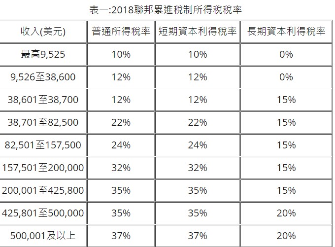 資本利得包含在申報義務人的收入中,以確定適用於資本收益的稅率。如下表,以單身為例,列舉2018年聯邦累進稅制所得稅稅率(如下表一)。