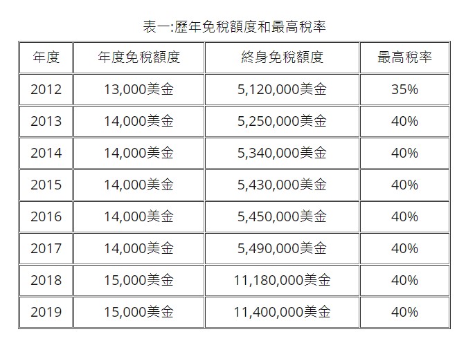每個美國贈與人都有兩種免稅額度可以使用。一個是每年的年度免稅額度,另一個是終身免稅額度。兩種免稅額度均會不定期調整,以跟上通貨膨脹和立法變化的步伐。根據美國常見的核課期限,歷年來免稅額度和最高稅率(如下表一)。