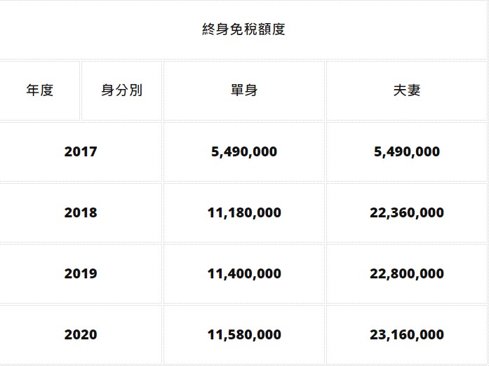 公布後自2020年1月1日施行,於2020年申報2019年度贈與稅開始適用。換句話說,個人可以將11,580,000美元留給繼承人,而無需支付聯邦贈與稅,而美國公民的夫妻兩人若透過規劃,可以從贈與金額中扣除兩倍終身免稅額度23,160,000美元。要特別注意一點,這種優惠增加的免稅額度將在2025年後停用,回落至500萬美元左右。