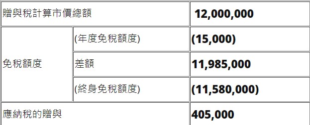 假設:終身免稅額度從未使用,贈與人和受贈人為美國公民或永久居民。2020年父親贈與兒子一棟別墅,市價評估為 12,000,000美元,由於年度免稅額度是15,000美元,因此15,000美元的贈與是免納稅的。差額11,985,000美元可以選擇使用終身免稅額度。計算結論是2020年度需要申報贈與稅,同時需要計算繳納的贈與稅。
