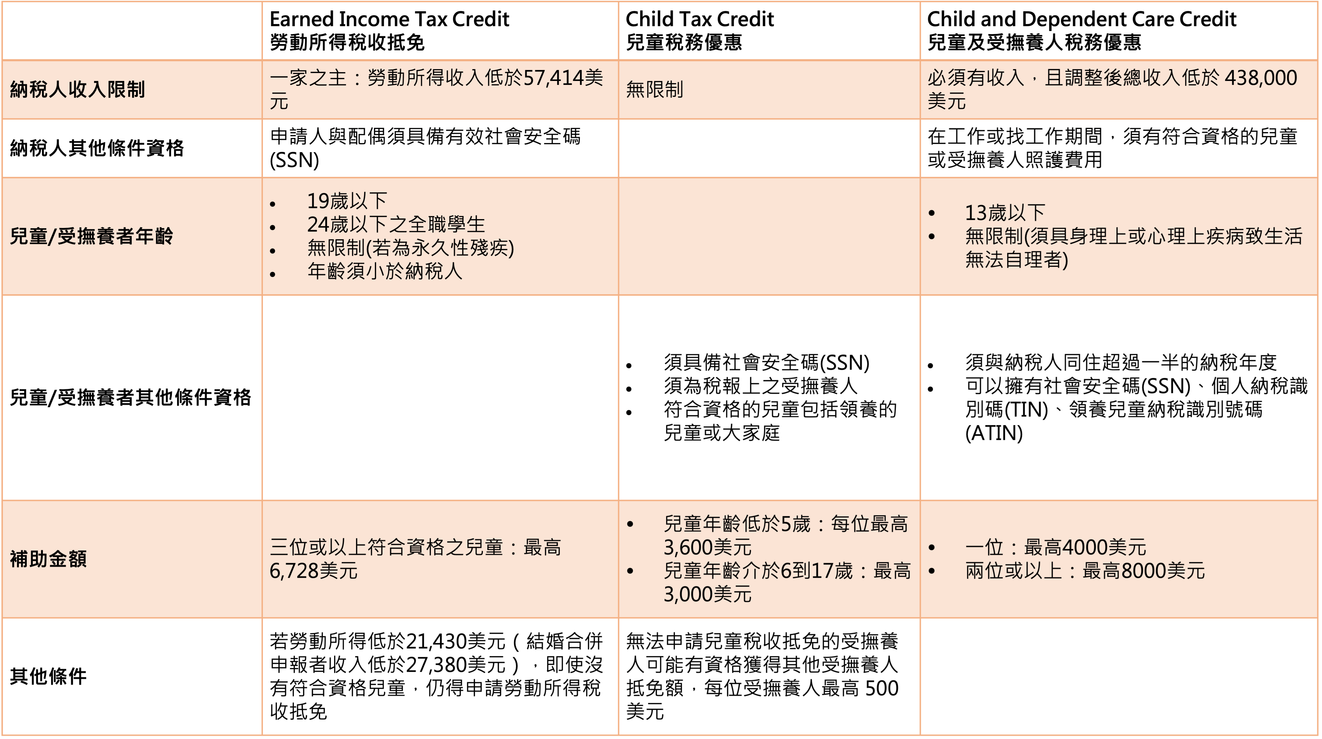 關於美國與兒童相關之稅務優惠,本篇將重點整理成以下表格及問題: