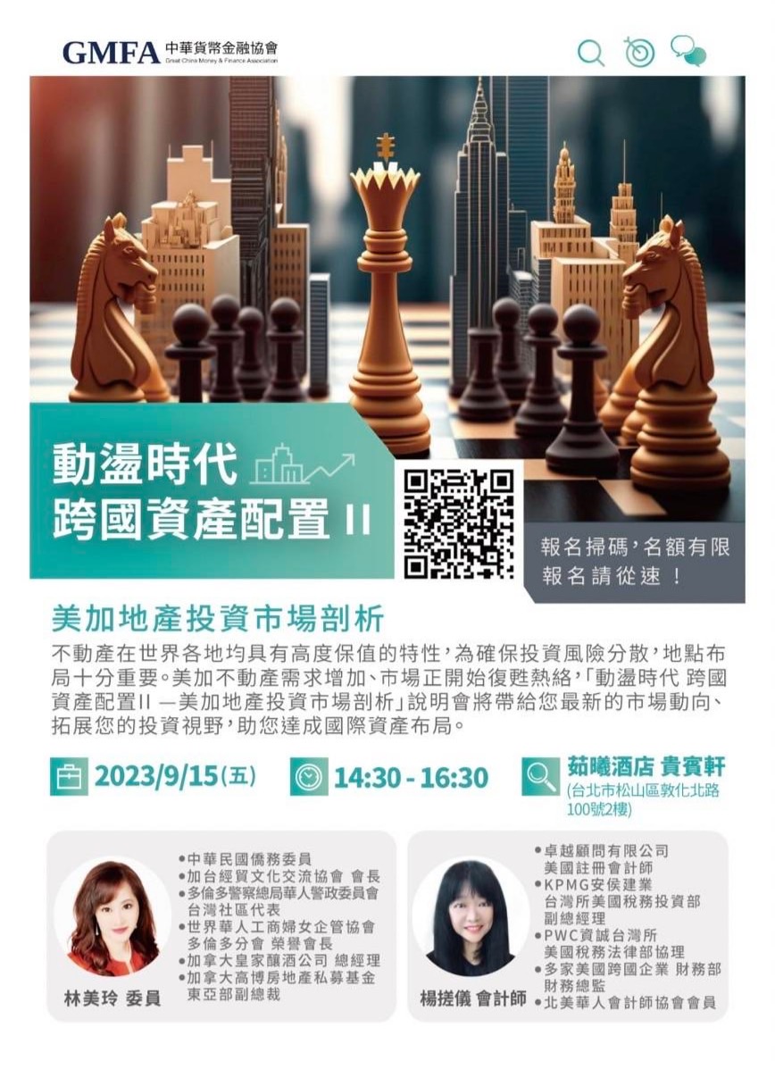 楊會計師(Joy)受邀主講中華貨幣金融協會-跨國資產配置II說明會,將進行美加地產投資市場剖析議題分享。歡迎透過以下連結報名參與活動,活動相關資訊如下: