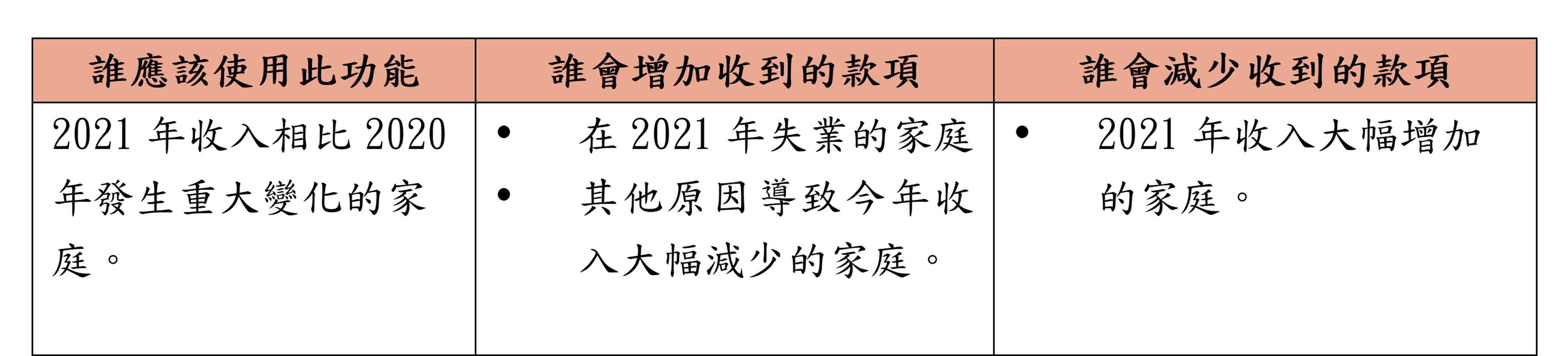 對於那些2021年收入相比2020年收入發生較大變化的家庭來說,若想要提高或降低他們每月付款金額,新的收入功能可以幫助這些家庭在 2021 年獲得正確的子女稅務優惠預付款。